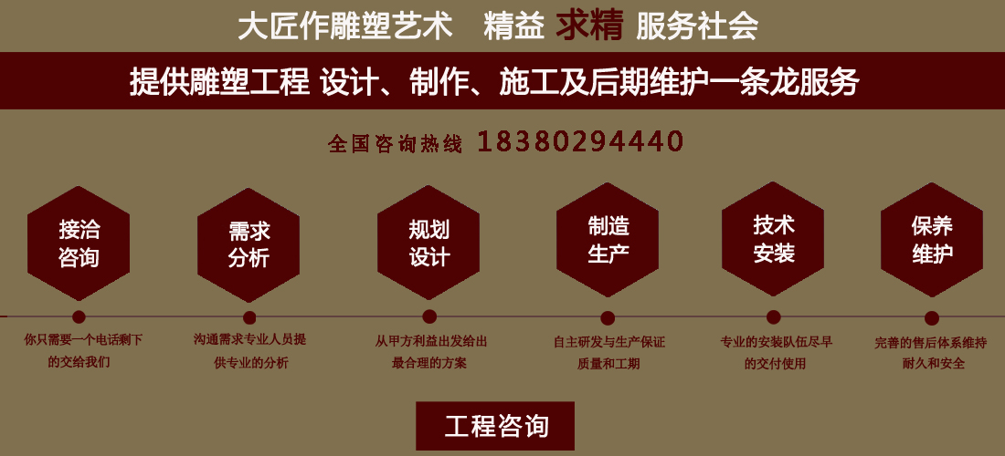 成都大匠作雕塑有限公司,是經(jīng)成都工商局審定注冊的正規(guī)專業(yè)雕塑制作及工程安裝服務(wù)機構(gòu),是由一群年輕富有朝氣的年輕人創(chuàng)辦,發(fā)軔于四川省成都市龍泉驛區(qū)。它是一家******于創(chuàng)作、制作和銷售為一體的公司。大匠作擁有多年從事公共藝術(shù)的專業(yè)人員和雕塑制作人組成的核心團隊,為您提供專業(yè)、具創(chuàng)新的設(shè)計及制作服務(wù)。公司成立以來,秉承“******服務(wù)、誠信為本”的宗旨,以客戶需求為目標導向,不斷學習,進取,優(yōu)化和提高服務(wù)質(zhì)量,公司向您******——“您的滿意***是我們的信譽”,我們將以飽滿的熱情和******的服務(wù)贏得您的贊譽和支持。